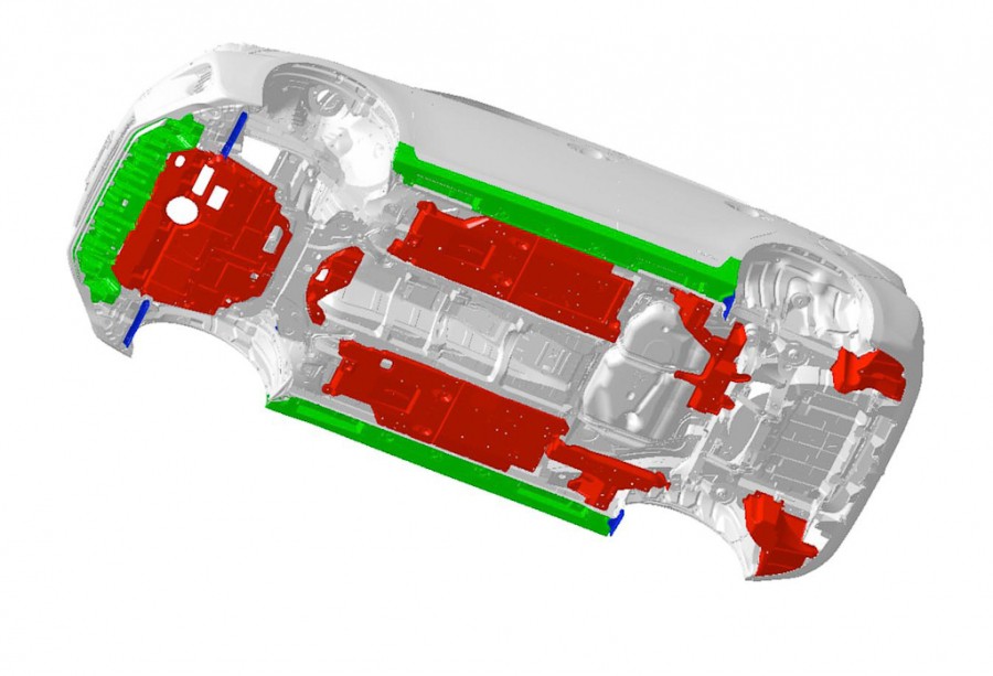 Pero para ver lo mejor hay que levantarle el vestido y mirarle los bajos. Es entonces cuando aparecen los paneles que carenan diferentes órganos, uno para el motor delantero, otro para el trasero (el eléctrico), otro para la zona central del piso, otro más para el depósito de combustible, etc.