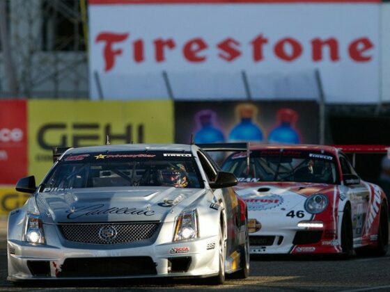 Los Cadillac CTS-V Coupe de Johnny O’Connell y Andy Pilgrim prácticamente subiéndose por las paredes del circuito de Long Beach durante la tercera carrera de la Sports Car Club of America World Challenge.