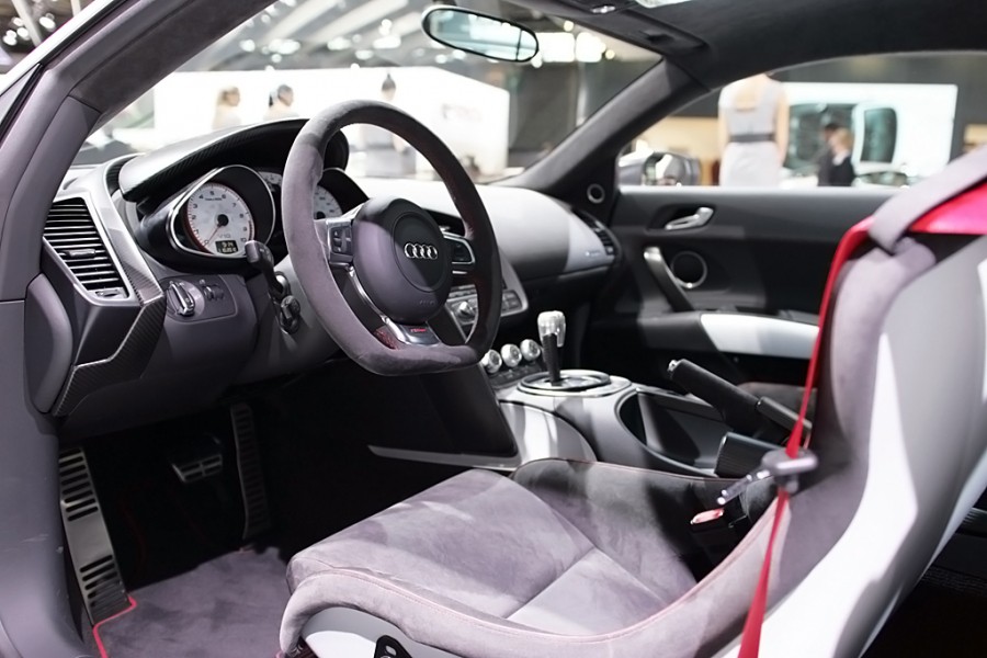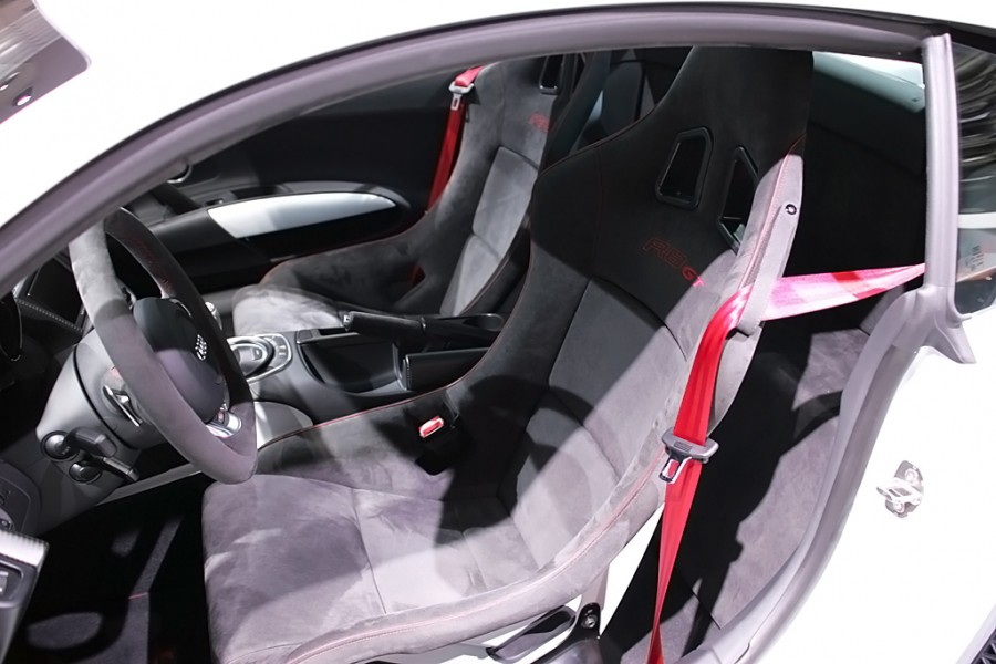Saltan a la vista nuevamente las modificaciones en el espectacular habitáculo, en el que se ha prescindido de buena parte de los elementos de confort y se ha colocado una moqueta ligera que ha conseguido arrancar 7,9 kg al modelo de base.